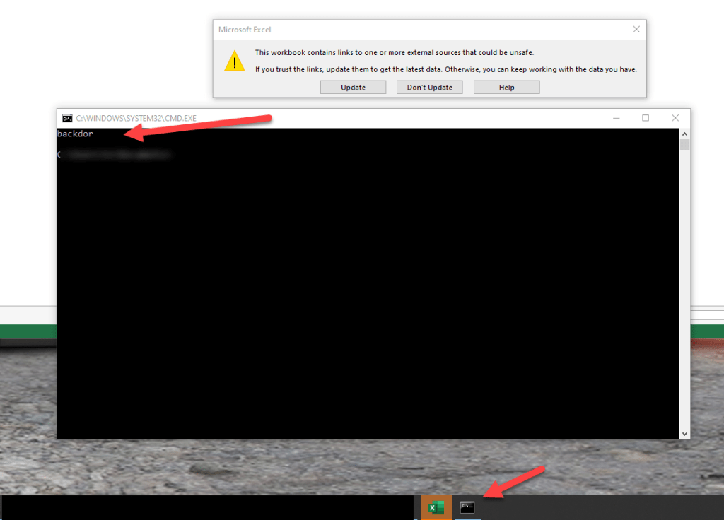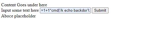 For testing purposes i will use a very simple payload “=1+1*cmd|’/k echo backdor’!z” which opens an command prompt and display the texst backdoor. More payloads can be found here https://github.com/swisskyrepo/PayloadsAllTheThings/tree/master/CSV%20Injection also note that could be other that are more relevant for other application and not Excel specificly.